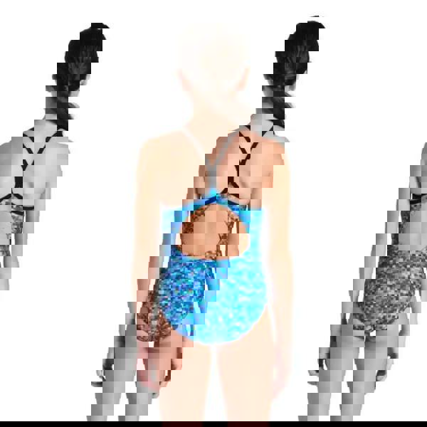 The Girls Pooltiles Lightdrop Swimsuit from Arena features an abstract pattern resembling pool tiles in blues with black straps and is designed for frequent training or school swimming sessions. It's made from an extremely chlorine-resistant Maxlife Eco swim fabric that protects skin from the sun, is quick to dry, has UPV 50+ UV protection and is super durable. The open back in combination with the thin straps and medium-cut leg provide maximum freedom of movement, excellent feel of water and less drag.