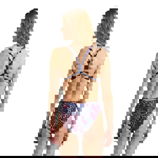 The Kikko Pro Challenge Back Swimsuit from Arena is made from 100% Polyester - MaxLife Eco. This Kikko Pro features a striking repeat pattern in navy with highlights of white. This swimsuit is designed to deliver maximum chlorine resistance, to be durable and long-lasting, and is made from more than 50% recycled polyester obtained from post-consumer plastic waste. With thin, non-restrictive straps and a high leg cut, cut away sides. this swimsuit offers reduced drag and superior comfort for training and leisure swimmers.