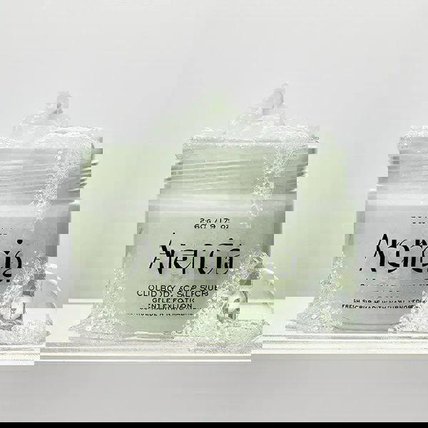 Introducing the Arencia Fresh Cloud Scrub in Geranium & Primrose – a luxuriously fluffy, dual-purpose scrub for both scalp and body.