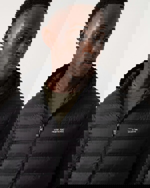 Crafted from a durable, water-repellent outer shell, the jacket is filled with high-quality down insulation to keep you warm without adding bulk. The minimalist silhouette features a high stand collar, front zip fastening, and elasticated cuffs and hem for a snug, comfortable fit. Finished with subtle Armani Exchange logo detailing on the chest and sleeve, it’s a refined essential for everyday wear.