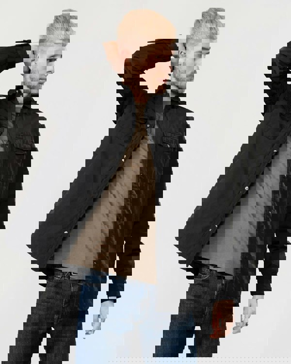 Contemporary lines and urban attitude for this laminated nylon jacket with button closure and collar.