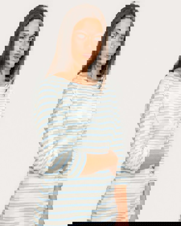 Breton striped pullover dress in jersey cotton with 3/4 length sleeves.