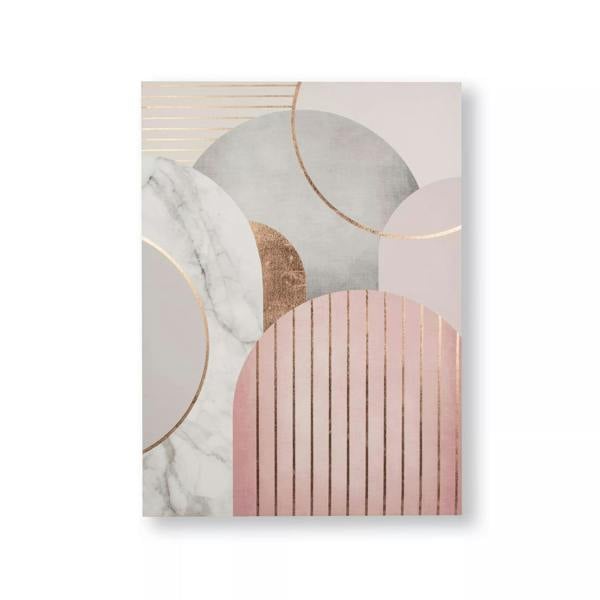 Inspired by art deco styles this beautiful, elliptical geometric design marries iconic marbling with on-trend geometric shapes. Grey marbling meets a stylish, soft colour palette of greys and pastel pinks with a hints of rose gold metallic creating a contemporary, eye-catching printed canvas design.