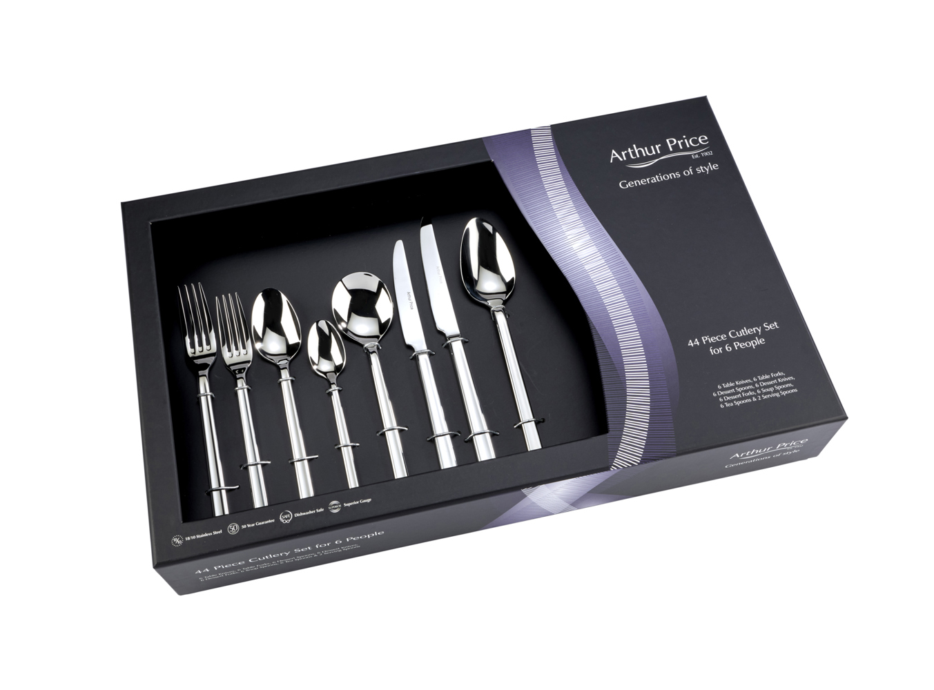 44 piece 'Horizon' design cutlery set for 6 people presented in a stylish gift box - set comprises 6 table knives, 6 dessert knives, 6 table forks, 6 dessert forks, 6 dessert spoons, 6 soup spoons, 6 tea spoons and 2 table/serving spoons.