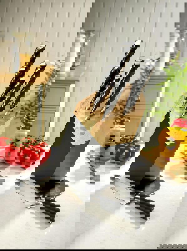 This Arthur Price 6 piece black and wooden knife block set combines the gorgeous appearance of traditional wooden design with hints of contemporary influence. Each knife is made for comfort and beautifully balanced with sleek black handles and stainless steel blades. This set includes the following knives: 1 x bread knife used for slicing bread cleanly and easily, 1 x slicing knife used for carving larger sized meats, 1 x chef's knife used for chopping, slicing, dicing fruits and vegetables, 1 x utility knife used for cutting, peeling and slicing and 1 x paring knife used for peeling, slicing and paring fruits and vegetables. The stainless steel blade of each knife provides precise and wonderfully easy dicing and slicing. All housed in this beautiful block. Supplied with a 10 year Arthur Price guarantee for peace of mind for years to come.