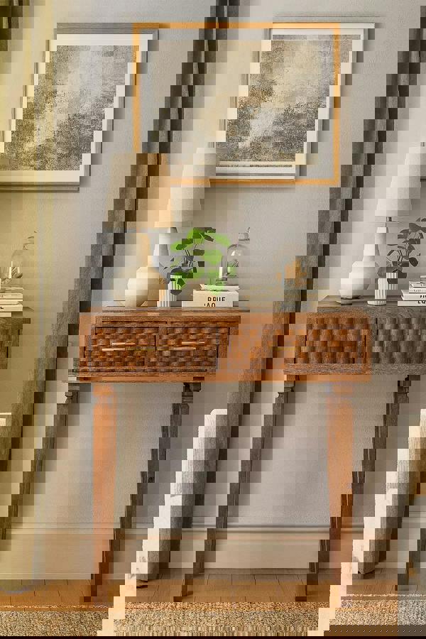 Add a touch of refined texture and warmth with the Arno Console Table in Golden Teak. Expertly handcrafted from 100% solid mango wood, this elegant piece features intricately carved drawer fronts that celebrate artisanal detail. The natural golden tones highlight the woods grain, while slender legs and brass-finished handles complete the look with understated grace. Whether placed in an entryway, hallway, or behind a sofa, this table brings timeless character and practical charm to any setting.