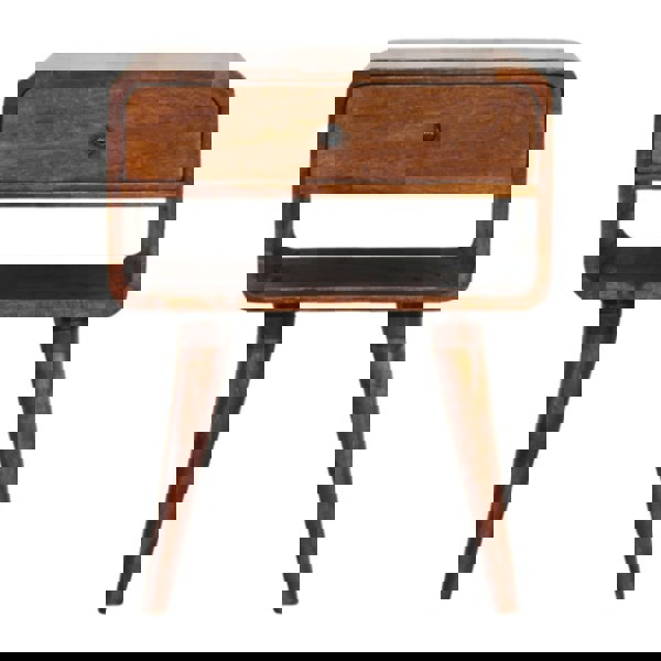 IN3993 A perfect fusion of mid-century modern aesthetics and functionality, this bedside table is handcrafted from 100% Solid Mango Wood in a rich chestnut finish. Featuring a smooth, curved silhouette, it includes a single drawer with a brass knob for an elegant touch, along with an open shelf for additional storage. The tapered Nordic-style legs enhance its sophisticated appeal, making it a stylish yet practical addition to bedrooms or living spaces. Designed for durability and sustainability, this timeless piece brings warmth, character, and refined craftsmanship to your home.