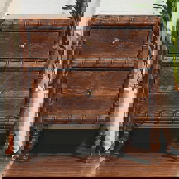 IN4044 This nightstand is crafted from 100% solid mango wood in a rich Roasted Almond finish. Featuring a bamboo-inspired frame, turned legs, and elegant brass knobs, it blends tropical charm with refined design. Two spacious drawers provide practical bedside storage, making it a versatile and stylish addition to any bedroom or reading nook.