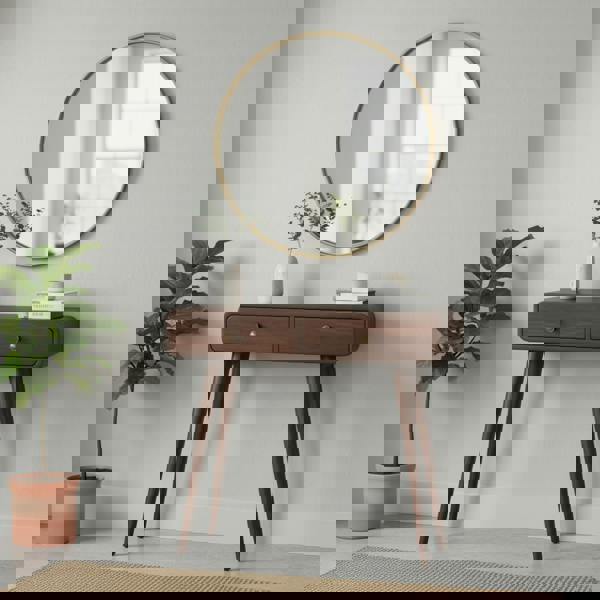This simple, elegant console table has beautifully curved edges to fit perfectly in any living space, this 100% solid mango wood unit has been built with sustainably sourced timbers and has two drawers to help you keep your home organized by storing away any little household objects. It has shiny knobs and has a light walnut finish with 4 Nordic style legs.