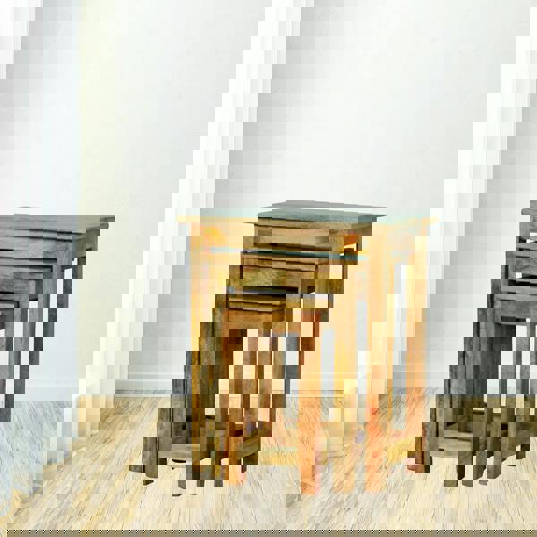 IN064 This set of 3 stools is crafted from 100% solid mango wood in an oak-ish finish, offering both strength and versatility. Perfect as extra seating, side tables, or everyday use, the compact design allows them to tuck neatly away when not needed—ideal for small spaces. Each stool is individually hand-distressed for a unique character, ensuring no two pieces are exactly alike.