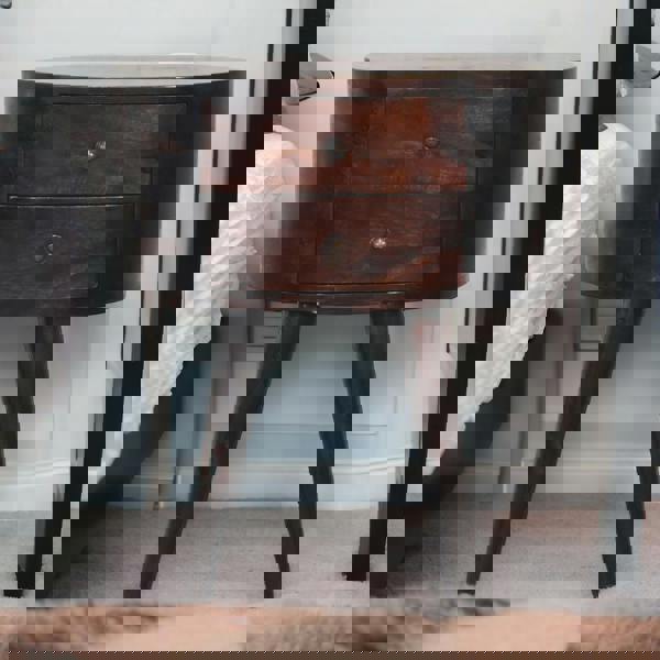 IN3644 This solid wood bedside is crafted from 100% solid mango wood in a light walnut finish and features a unique shaped design with smooth rounded edges. Designed with two mini drawers fitted with shiny knob handles and Nordic-style legs, it offers simple, practical storage and a clean look—making it an easy, stylish addition to any bedroom.