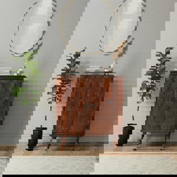IN3746 This mini classic cabinet is crafted from 100% solid mango wood in a warm chestnut finish and features two internal shelves for practical storage. Complete with shiny knob handles and Nordic-style legs, it’s a cute yet functional addition to a living room or bedroom. This petite piece is part of the Recession Collection.