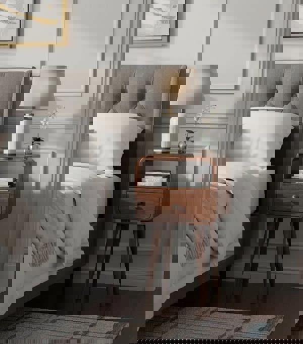 IN3858 This mini version of the popular Curved Bedside is small yet highly practical, making it ideal for holding nibbles, drinks, or a lamp. Crafted from 100% solid mango wood in a warm honey caramel finish, it features softly curved edges to suit any living space. Complete with one drawer, one open slot, and four Nordic-style legs, this petite piece is part of the Recession Collection and works beautifully throughout the home