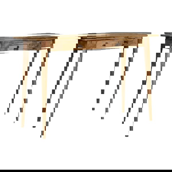 IN1578 This timeless and understated light solid wood desk features a sleek Nordic-style design, constructed from 100% solid mango wood with a smooth oak-ish finish, set on 4 Nordic-style legs, offering essential storage with a decent-sized tabletop, 2 drawers with shell handles, and cable access for easy electronic device connectivity.