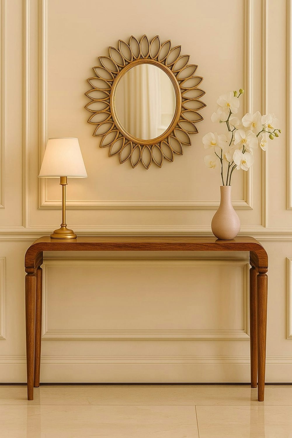 IN4048 The Arcus Console Table, crafted from solid mango wood with a warm Amber Oak finish, features curved edges and squared legs for a sleek, timeless look. Perfect for entryways or living rooms, it offers a stylish surface for décor or essentials.