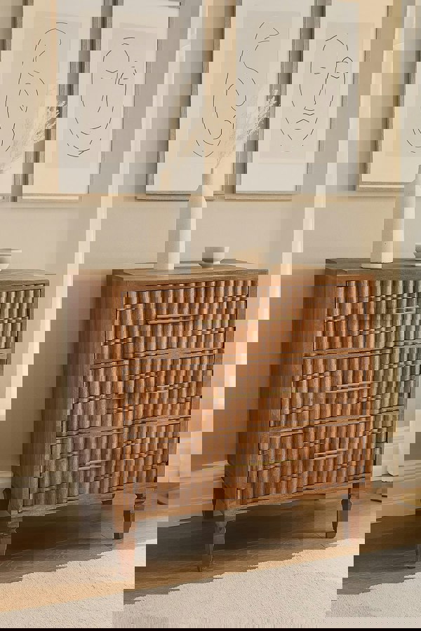 Discover the understated luxury of the Arno Chest, a striking piece that encapsulates the essence of artisanal craftsmanship and timeless design. The radiant Golden Teak finish highlights the chest’s natural allure, offering a warm and inviting atmosphere that enhances any room. With its rhythmic, block-carved façade, this piece not only captivates the eye but also demonstrates the intricate skill involved in its creation, capturing shifting light and revealing rich woodgrain tones beneath.