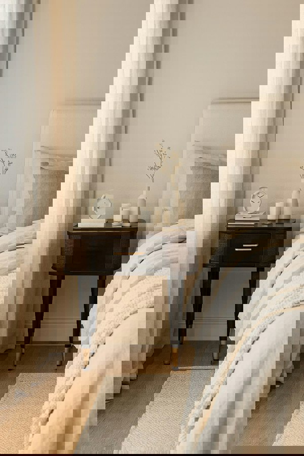 Elevate your bedroom with the Belmont Bedside, finished in a rich Velvet Mocha tone. Crafted from 100% solid mango wood, this piece features handwoven rattan panels on either side of the central drawer, elegantly offset by brushed brass hardware and matching brass-capped legs. A refined blend of texture, craftsmanship, and utility—perfect for modern interiors with a timeless soul.