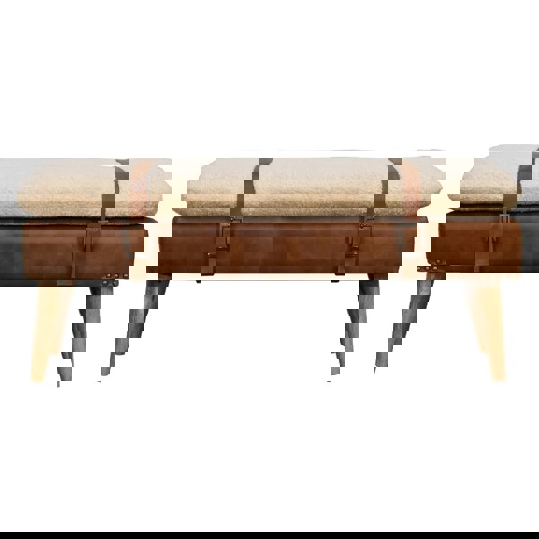 IN3300 This handwoven upholstered furniture piece is made of 100% cotton and natural yarn, incorporates buffalo hide leather for a rich blend of colours and textures, features a belted strap design, includes solid wood legs with an oak-ish finish, derived from the French word for 'curled' or 'ringed' yarn or fabric, and offers a unique combination of style, strength, and durability