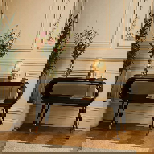 Elevate your interiors with this show-stopping Velvet Mocha Media Unit, defined by its fluid, continuous curve design. Crafted from 100% solid mango wood in a rich, hand-applied Velvet Mocha finish, it blends organic form with timeless style. The twin-shelf structure adds versatility, while the gently tapered legs, tipped with polished brass, bring a luxe contrast. Whether styled in an entryway or behind a sofa, this piece offers both elegance and function in equal measure.