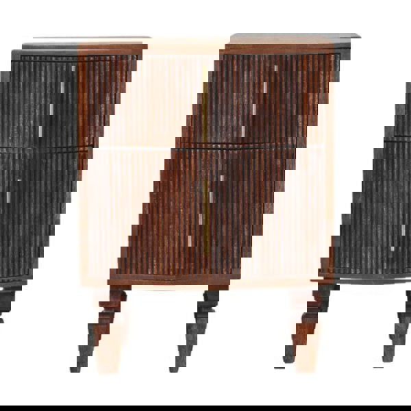 Introducing the Harper Nightstand, a bold statement in sculpted woodwork and timeless elegance. Crafted from 100% solid mango wood and finished in a rich Amber Oak tone, this bedside table features two vertically grooved drawers with elongated brass handles, offering both texture and utility. Its raised carved legs lend it a classic foundation, while the curved front adds a refined, modern twist. Perfect for framing your bedside or enhancing a quiet reading nook, the Harper Nightstand is a perfect blend of artistry and function.