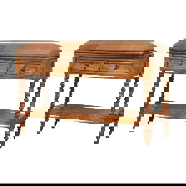 Elevate your entryway or bedroom with the Amber Oak Leather Spindle Bench—a seamless blend of comfort, craftsmanship, and storage. Crafted from 100% solid mango wood in a warm amber oak finish, this bench features a plush padded leather seat, two practical drawers, and a lower shelf for added functionality. The sculpted spindle legs lend timeless character, while the antique knobs add a vintage accent. Whether you're slipping on shoes or showcasing decor, this bench brings effortless charm and utility to any space.