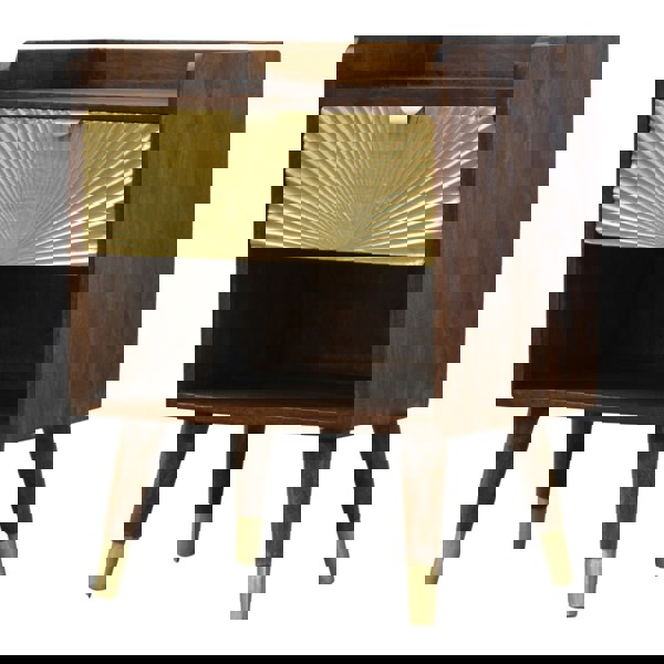 The process begins with the careful selection of fruit mango wood, prized for its durability and intricate grain patterns. Once chosen, the wood is treated and polished to achieve the rich chestnut finish that defines this bedside table. The brass plating on the drawer is applied with precision, ensuring that the sunburst pattern is both eye-catching and durable. As a result, each bedside table is functional furniture and a work of art that brings a touch of handmade charm into your home.