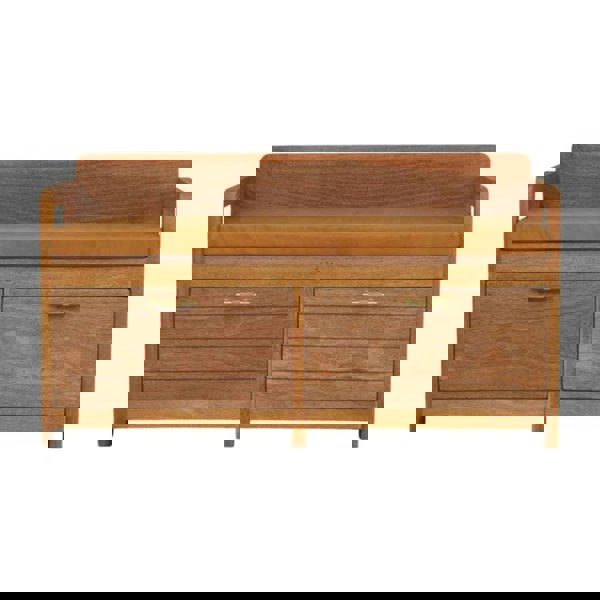 Introducing the Oxford Storage Bench, a perfect fusion of style and functionality. Crafted from 100% solid mango wood with a natural oak-ish finish, this bench features a comfortable buffalo hide leather cushioned seat in a warm tan tone, making it ideal for seating in entryways, bedrooms, or living spaces. Beneath the seat, two spacious pull-out drawers with sleek brass handles provide ample storage for shoes, linens, or everyday essentials. Its clean lines and sturdy frame exude rustic charm, while the compact design ensures versatility for various interiors. The Oxford Storage Bench is a timeless piece that elevates organization and style in your home.
