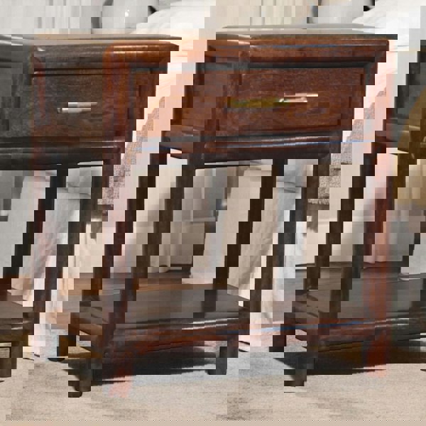 Refined and functional, this bedside table is handcrafted from 100% Solid Mango Wood in a rich chestnut finish, blending traditional craftsmanship with everyday practicality. It features a single drawer with a sleek brass handle and a sturdy lower shelf, ideal for books, baskets, or display pieces. With clean lines and thoughtful detailing, this piece brings warmth and elegance to any bedroom or living area. Crafted with care and built for longevity, itÂ’s a timeless addition to interiors that value both form and function.