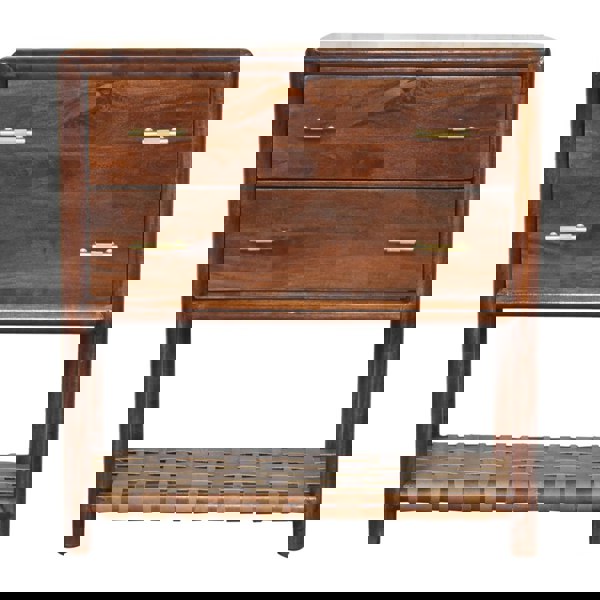 Introducing the Regency Woven 2-Drawer Nightstand, a stylish and compact storage solution. Crafted from 100% solid mango wood in a rich Chestnut finish, this piece features two compact drawers with elegant brass handles, ideal for storing smaller essentials. The standout feature is the woven braided bottom shelf, adding a touch of rustic elegance and functionality, perfect for displaying books or decor. Combining durability with sophisticated design, the Regency Woven Nightstand is a versatile addition to any bedroom or living space, offering both charm and practicality in a compact form.