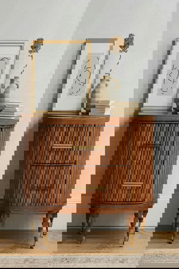 Elevate your bedroom with the Amber Oak Ribbed Bedside a harmonious blend of soft curves and striking detail. Handcrafted from 100% solid mango wood and finished in a warm amber oak tone, this piece features two ribbed-front drawers accented with slender brass handles. Its rounded silhouette and tapered legs with brass-capped feet offer a sophisticated mid-century flair, making it a stylish and functional addition to any space.