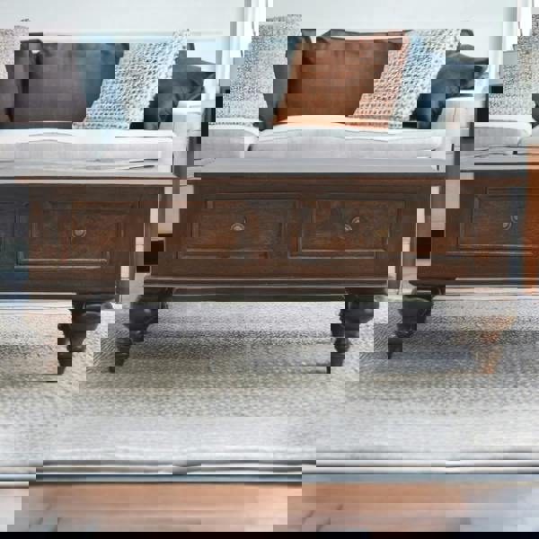 IN2013 This 4 Drawer Coffee Table features a beautiful light walnut finish that instantly refreshes your living space. Designed with shiny knob handles, hand-turned feet, and a rich wood tone, it blends visual appeal with everyday functionality. The four spacious drawers offer ample storage, making it both a stylish and practical addition to your home.