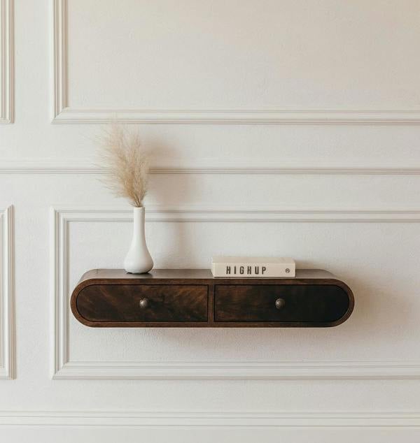 IN3855 This curved wall-mounted console table is a smart, space-saving solution that removes the need for legs. Crafted from 100% solid mango wood in a California walnut finish, it offers two drawers and a generous top surface for ornaments, plants, or books. Use it alone or pair it with the rest of the curved chestnut collection for a cohesive look.