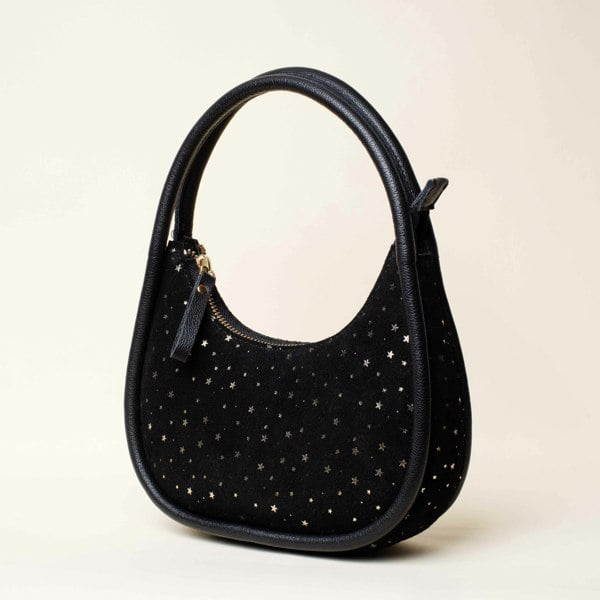 Sparkle and shine all season long with the 'FESTIVE BAG'! This black shoulder bag is crafted from genuine suede and full grain leather, featuring a zip closure and star embellishment. Perfect for adding a touch of playful glamour to any outfit. (Warning: may cause bag envy in others!)