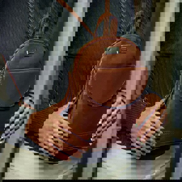 Handcrafted from the premium top grade pebble-grained 'Guild' Nappa leather, Assots 'George' is a timeless minimalistic design mini soft leather backpack. Tan leather adorned with antique gold zipper makes this neatly designed structured piece a must-have addition to your collection of small leather backpacks. Effortlessly stylish, multi-functional and lightweight is what this leather bag is all about.
