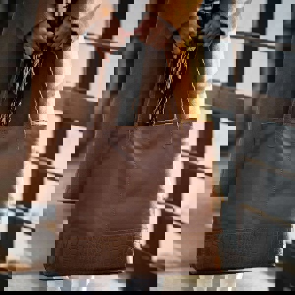 The 'Sienna' is carefully handcrafted with a combination of both croc and full grain naturally milled leather. This versatile tote can take you from desk to dinner with ease. It features a zip top closure to ensure all your belongings are stored safely and securely. The easy to carry unlined tote is lightweight yet spacious. Get organised with 'Sienna' the perfect tote bag for you to move about carefree ensuring you always have space.