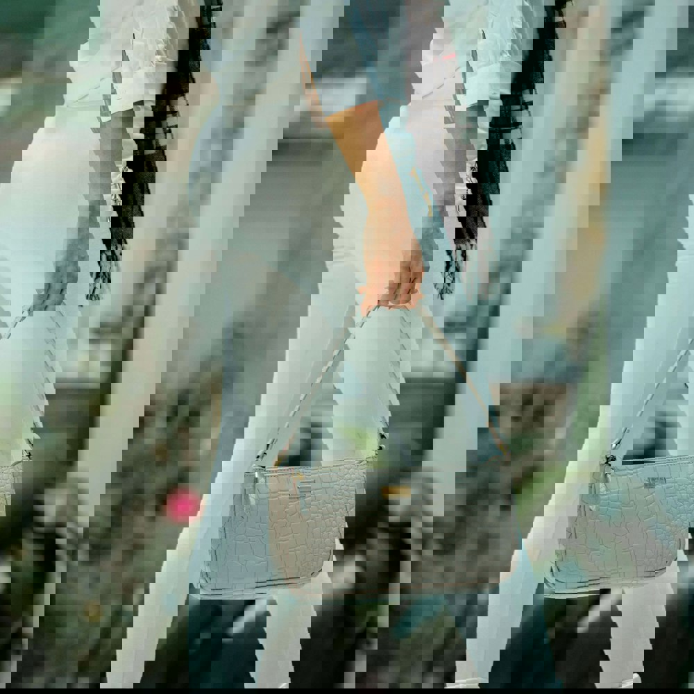 The 'Zara' baguette bag is handcrafted with genuine croc leather to give that designer look. This trendy slim leather shoulder bag features a metal zipper on top to ensure your belongings are kept safe and hassle free. The lightweight mini 'Zara' shoulder bag is a must have to your handbags collection and is seen styled by most celebrities. Style it up with 'Zara' the perfect compact leather shoulder bag ideal for all events and occasions.