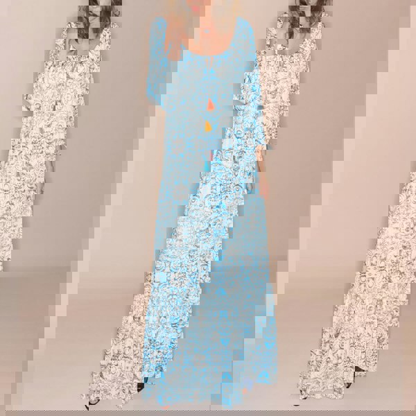 This beautiful long dress features a white and blue print and is finished with multicoloured tassels on the drawstrings. The adjustable shoulder ties allow you to style the dress for the perfect fit and comfortable wear.