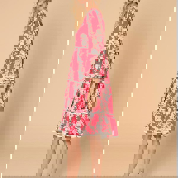 A playful dress adorned with a vibrant raspberry-red floral print. Each tier is delicately embellished with ivory pompom trims, adding movement and charm.