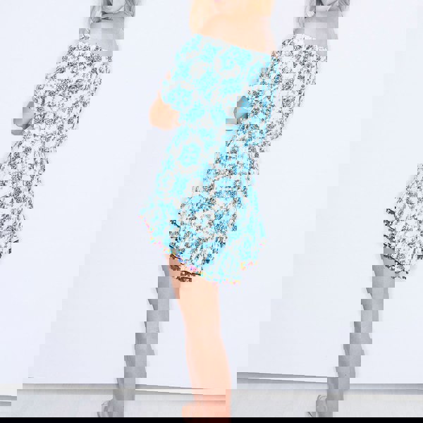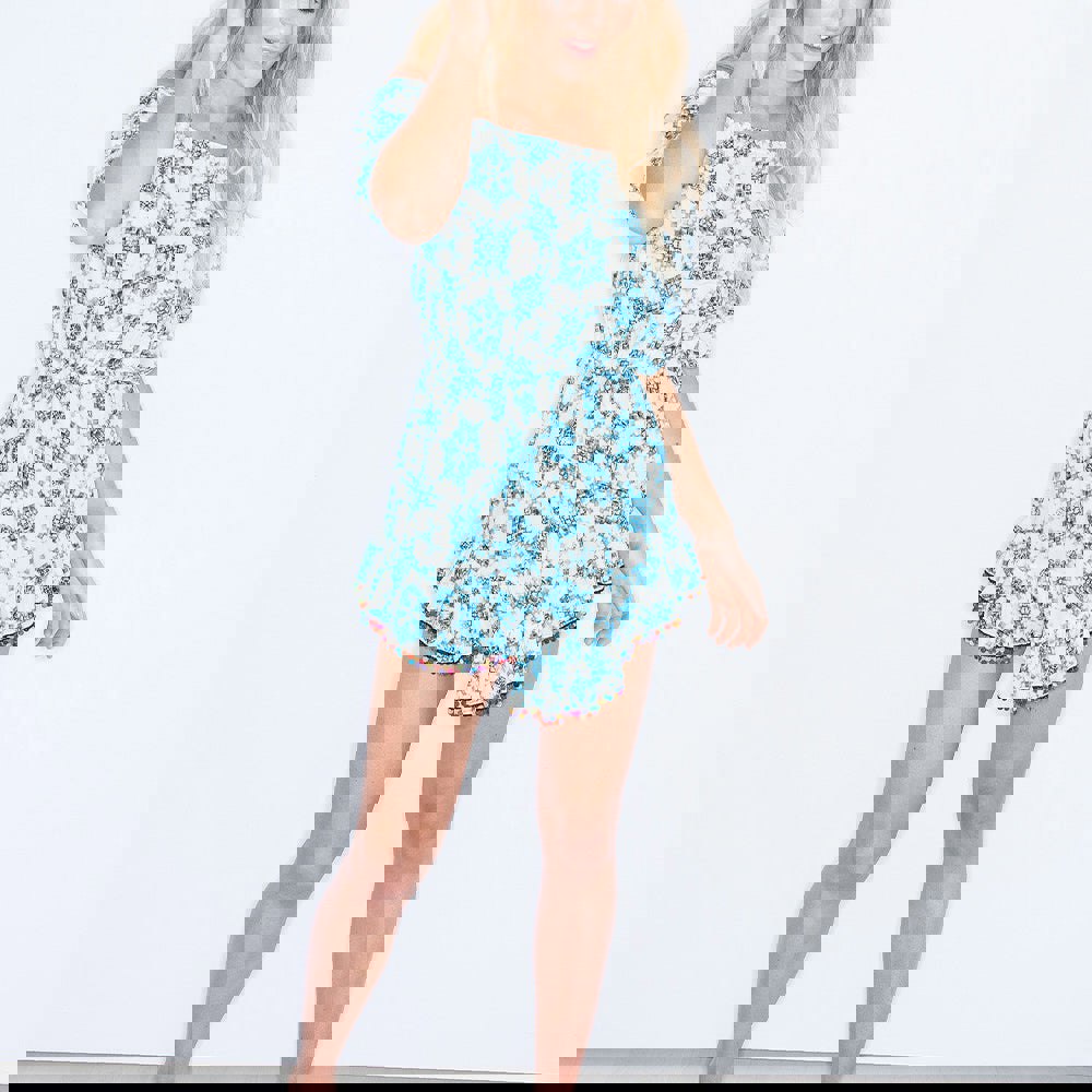 A soft, finely woven silk short dress showcasing a geometric print on a crisp white background. The design is beautifully finished with playful pompom trim along the hem of the delicate frills, adding movement and charm.