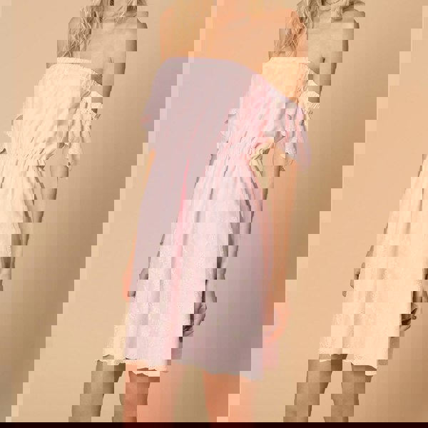 A playful short off-shoulder dress in candy pink embroidered cotton, featuring an elasticated neckline and waist for a comfortable fit. The fabric is embroidered on a century-old machine, giving it a vintage-inspired look and a luxurious feel.