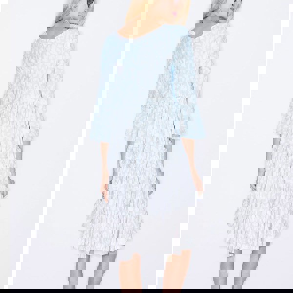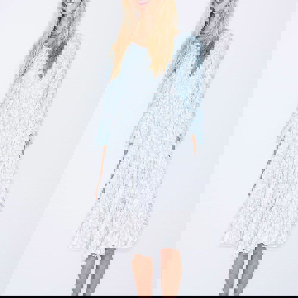 A fine cotton dress featuring a leopard print in soft blue and beige tones. The dress closes at the back with a concealed zip, and the sleeves are shaped with a subtle bell for a graceful touch. A versatile piece, perfect for the city, festivals with ankle boots, or on vacation.