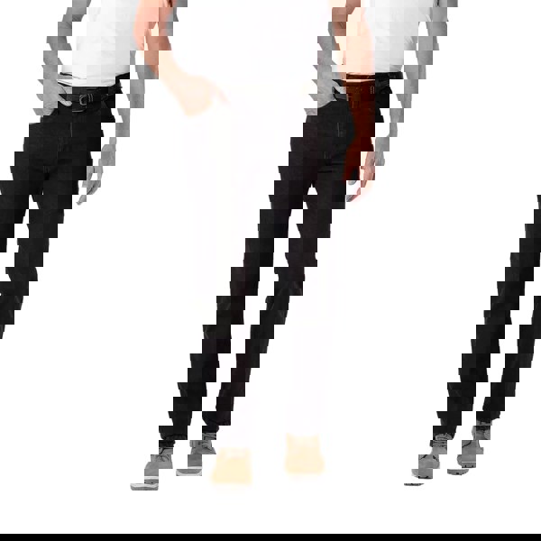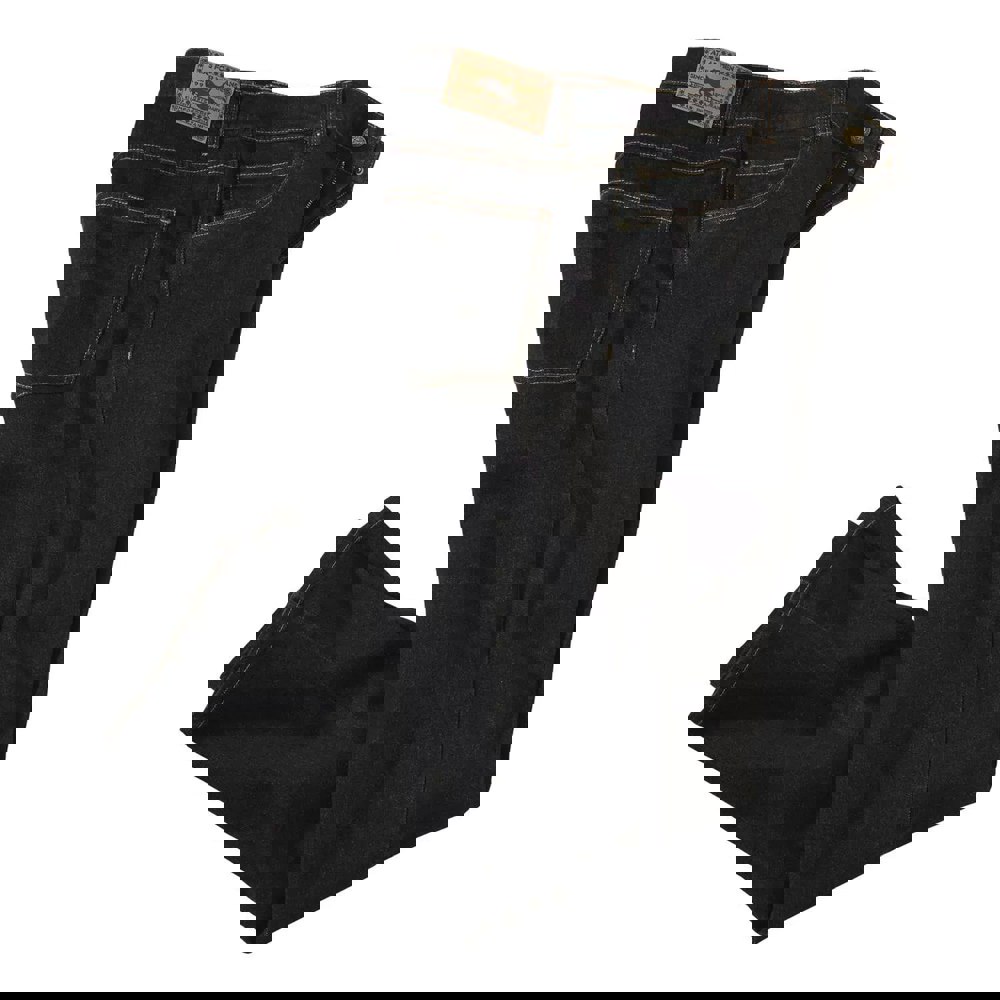 Practical detailing includes belt loops and contrast top stitching, with riveted reinforcement. Storage is arranged across five pockets, including two side pockets, a ticket pocket and two back patch pockets. The fabric technology is hardwearing.