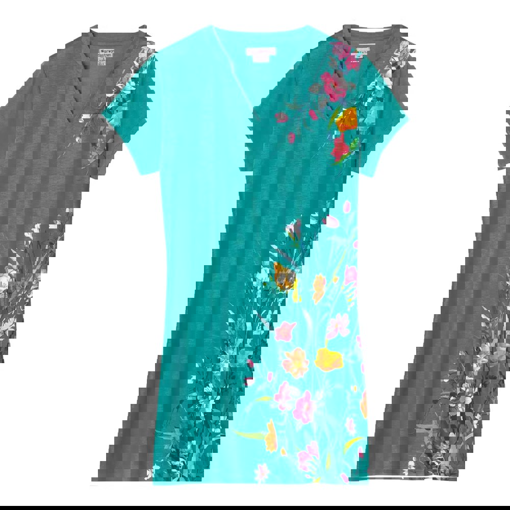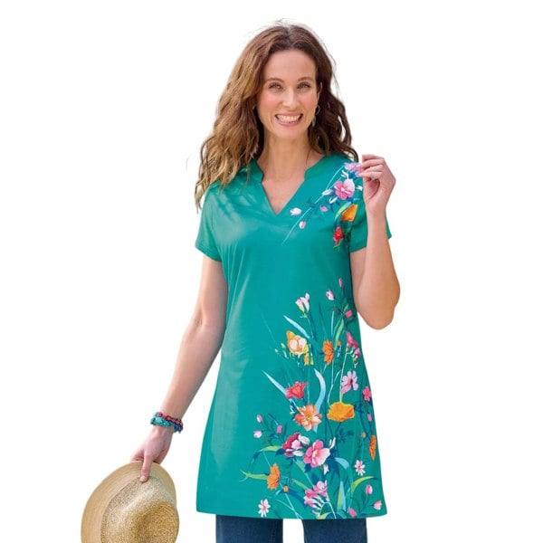 Refresh your casual wardrobe with this women’s longline T-shirt in a green floral print. Made from 100% polyester, it has a printed design and a djellaba neckline for a distinctive finish. Short sleeves and a straight hem keep the silhouette clean and simple, making it easy to wear on its own or as a layering piece.