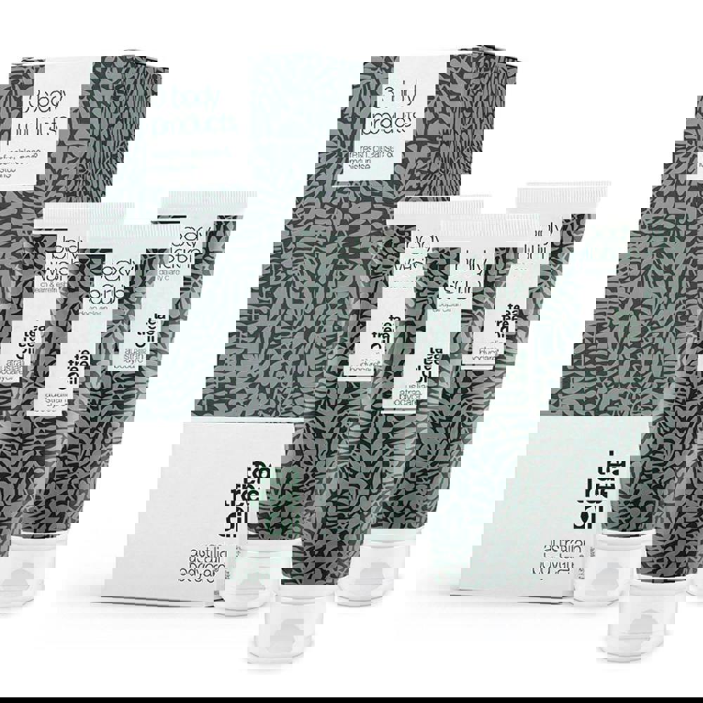 Harnessing the healing powers of tea tree oil, this kit brings together three body-care essentials to exfoliate, cleanse and nourish skin: