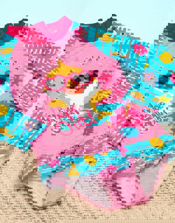 The vibrant blue and pink swimming costume is perfect for a day at the beach or pool - she'll love singing the kid's popular Baby Shark song whilst showing off her favourite characters including Mommy, Daddy, Grandma and Grampa shark