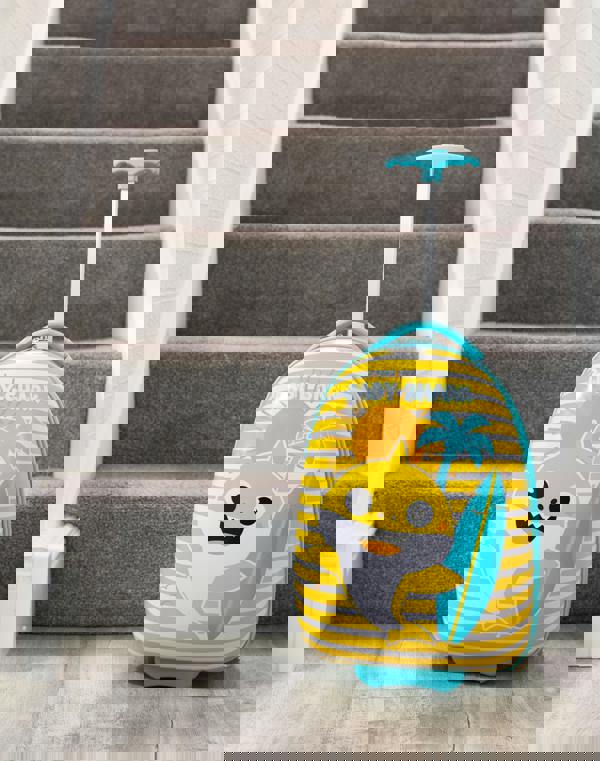 Holding a surfboard and basking in the shining sun, this blue and yellow suitcase is sure to bring a smile to your child's face.