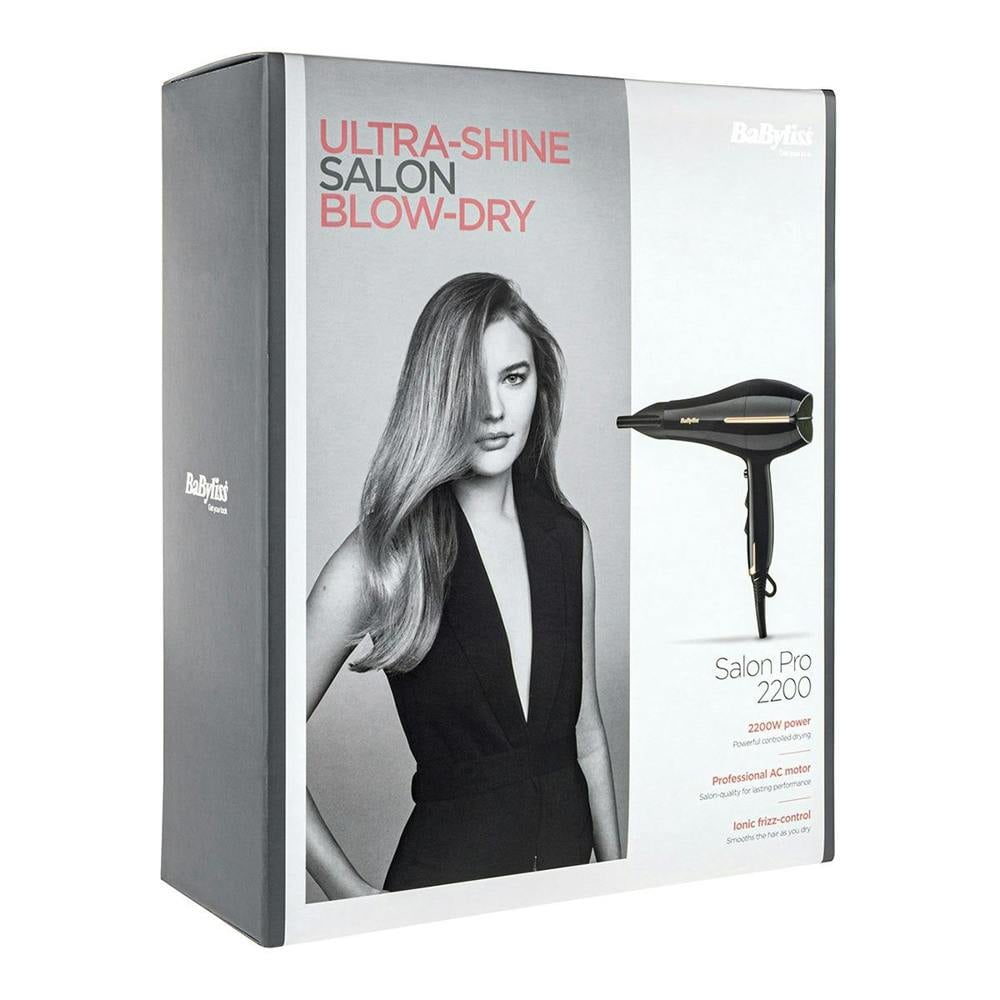 BaByliss Salon Pro 2200 Ultra Shine Salon Hair Dryer BA5552U delivers high-performance drying with a 2200W AC salon motor for strong airflow and fast results. Tourmaline-ceramic technology supports even heat distribution, while ionic frizz control helps reduce frizz and flyaways for a smoother finish.