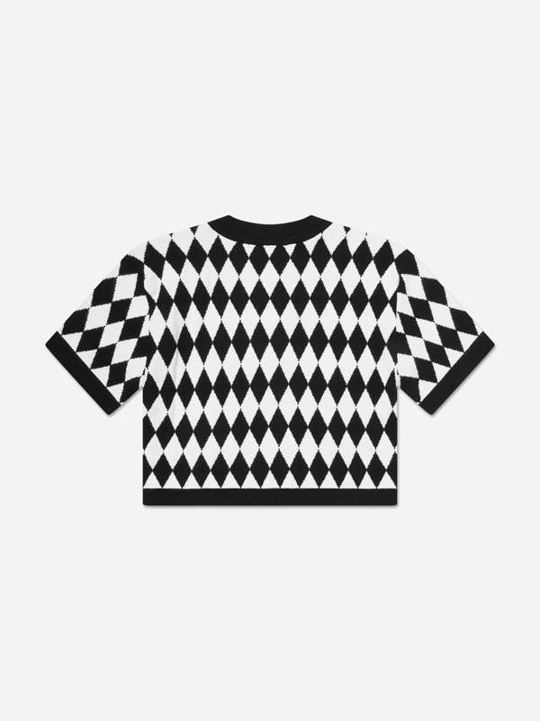 This Balmain girls knitted top comes in black and white with a diamond geometric pattern. The silhouette is finished with short sleeves and a round neckline for a clean, simple shape. Silver embellished buttons run down the front, adding a distinctive branded detail.