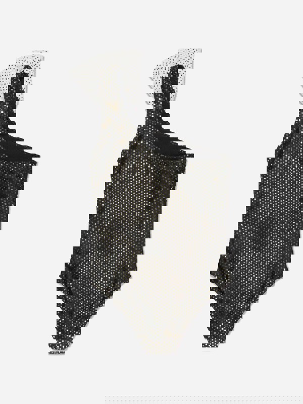 This girls swimsuit from Balmain pairs a one-shoulder silhouette with bold, statement detailing. A gold metallic sequin base creates a high-shine finish, while an enlarged bow adds sculptural impact. A ‘B’ Balmain badge sits at the edge for a clear branded sign-off.