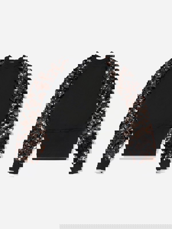 The long sleeves combine velvet and multicolour sequins for a standout contrast against the plain body. An elasticated waistband completes the silhouette.